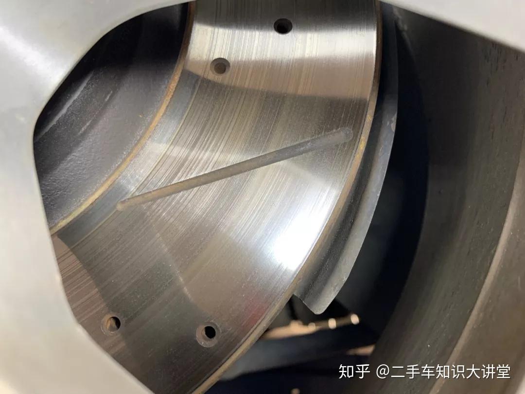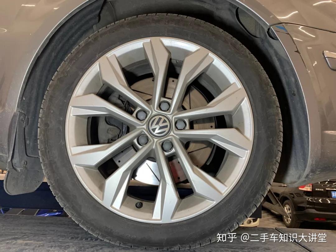 除了更换上下支臂、转向拉杆、轴承胶套、驱动半轴、车主还更换了打孔划线的刹车盘、刹车片,还更换了4只拆车的迈腾轮毂。