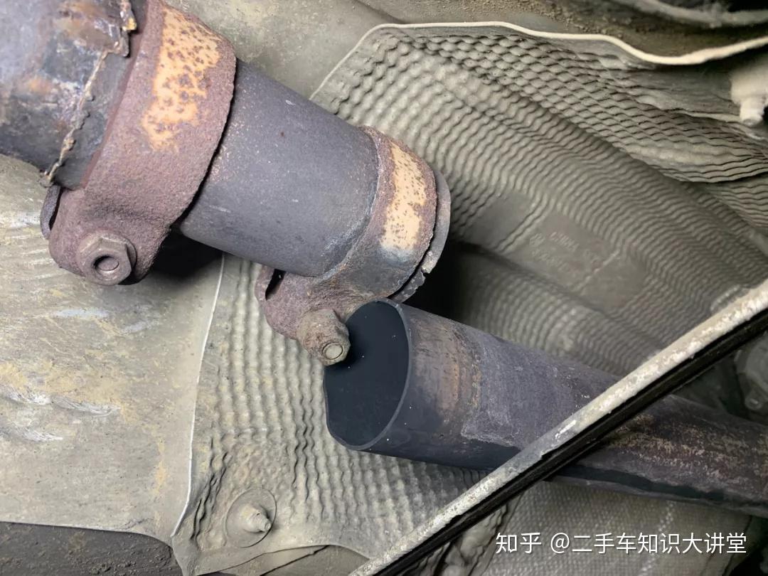 根据经验,我判断应该是排气管漏气了,废气没再经过消声器,所以导致声音巨大。回到公司上了架子一看,果不其然,排气从中裂开,断成了两截。