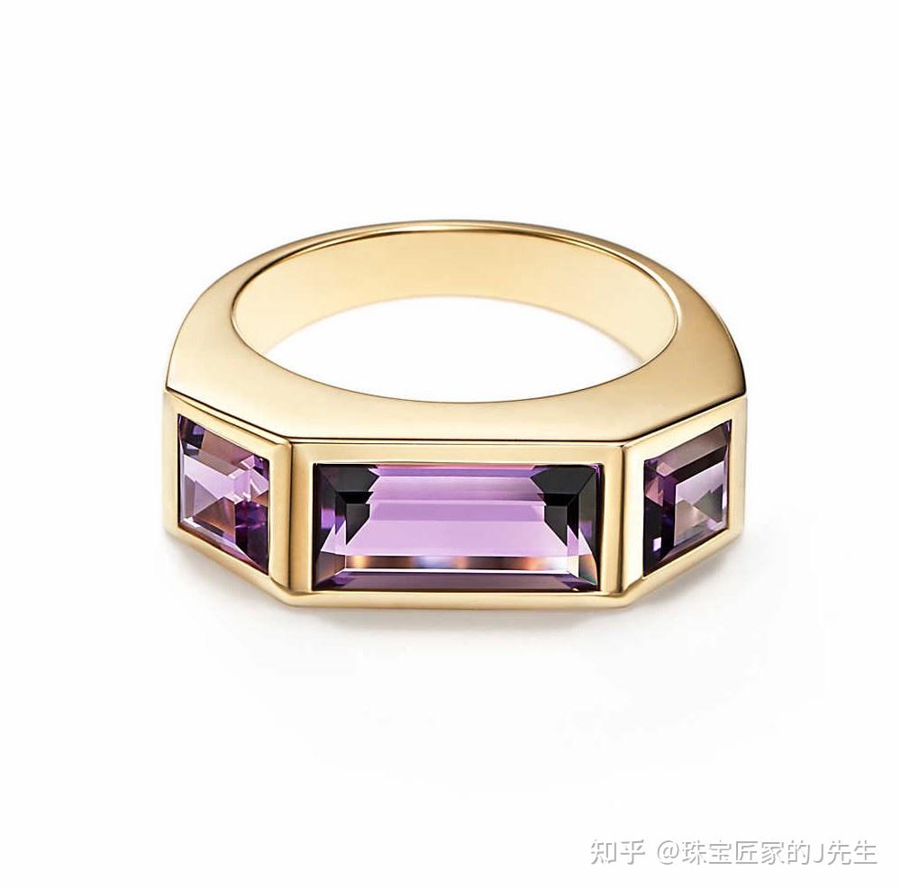 Tiffany的这枚紫水晶戒指,三颗长方形紫水晶包镶的戒指款式不同于普通排戒,圆润中带有棱角,简约而时尚。