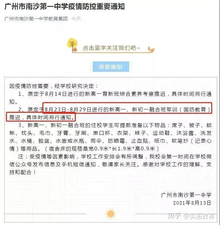 广州大学附属中学表示,原定的8月15日新初一学生报到暨军训动员家长会、8月18日至24日军训大型集体活动等均因疫情防控要求暂停。
