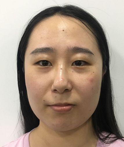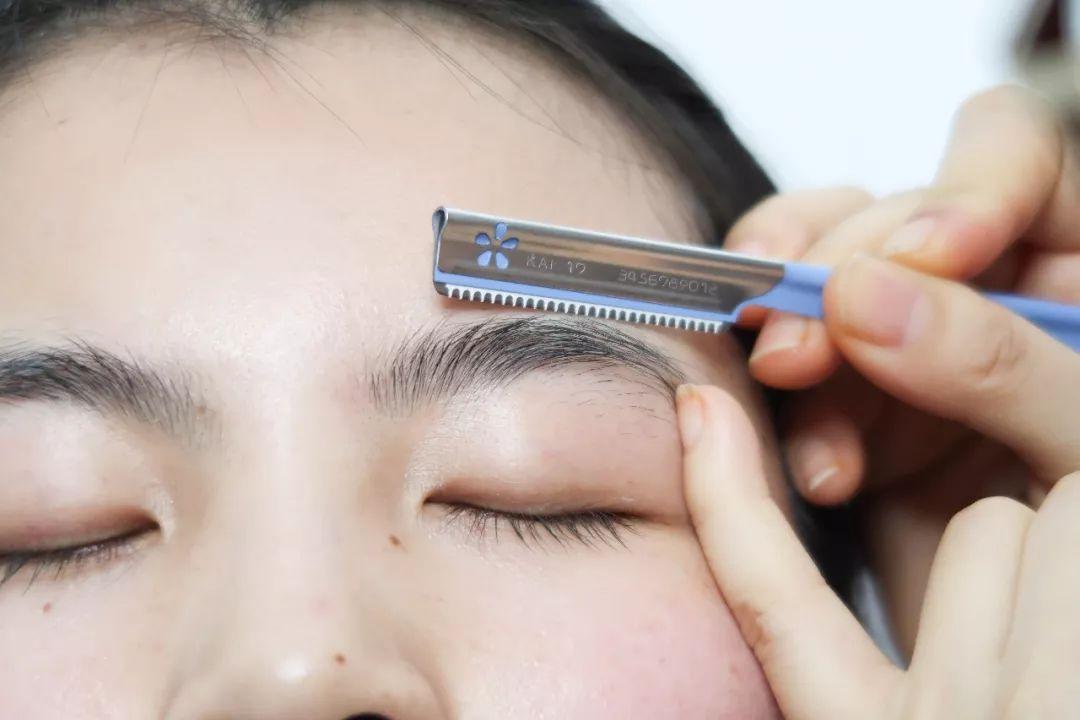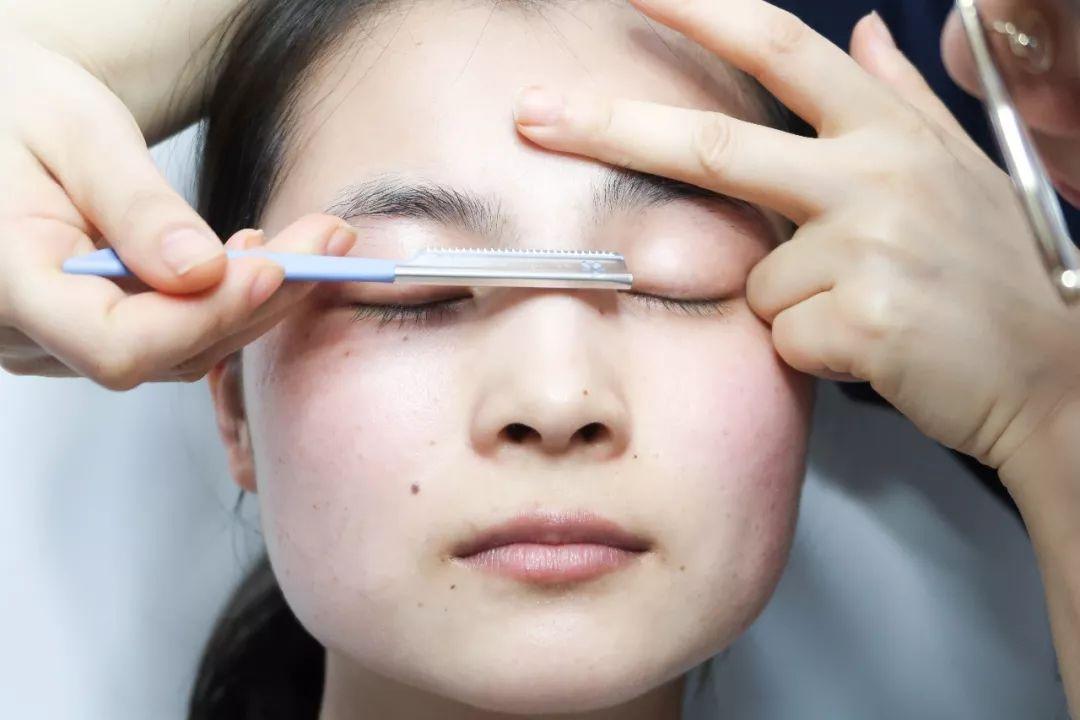 这次为大家演示修眉过程的模特是圆脸,眉眼距离稍有些近,所以我先把她的眉头抬高,修掉太靠下的杂毛,可以让眉眼间距显得稍稍远一些。