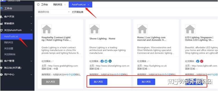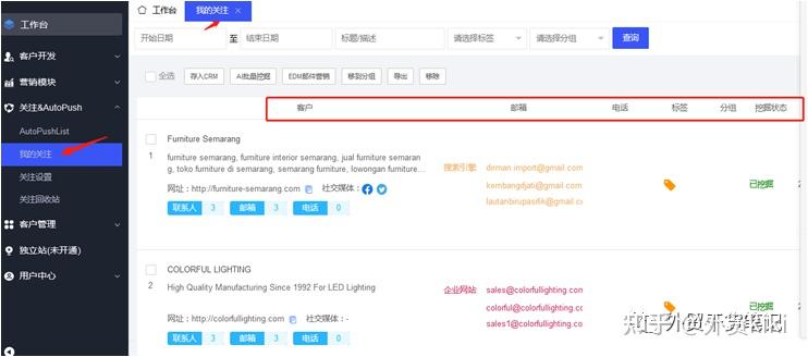 输入产品关键词点击搜索即可搜索到客户网站,邮箱,电话,针对精准的客户可以一键加入关注,后期软件会自动推荐同类型的客户