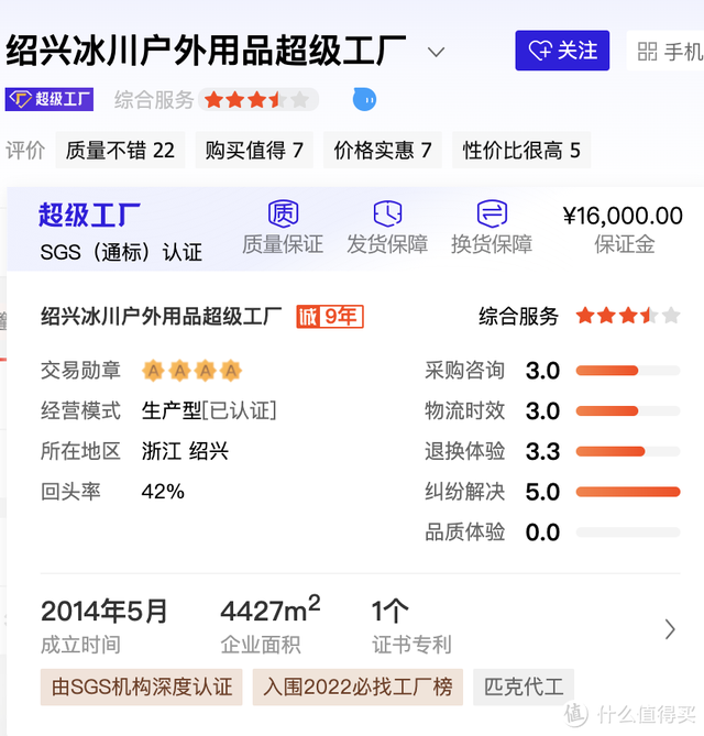 一家做户外装备的生产厂家,1688平台超级工厂认证,评价也都很不错。