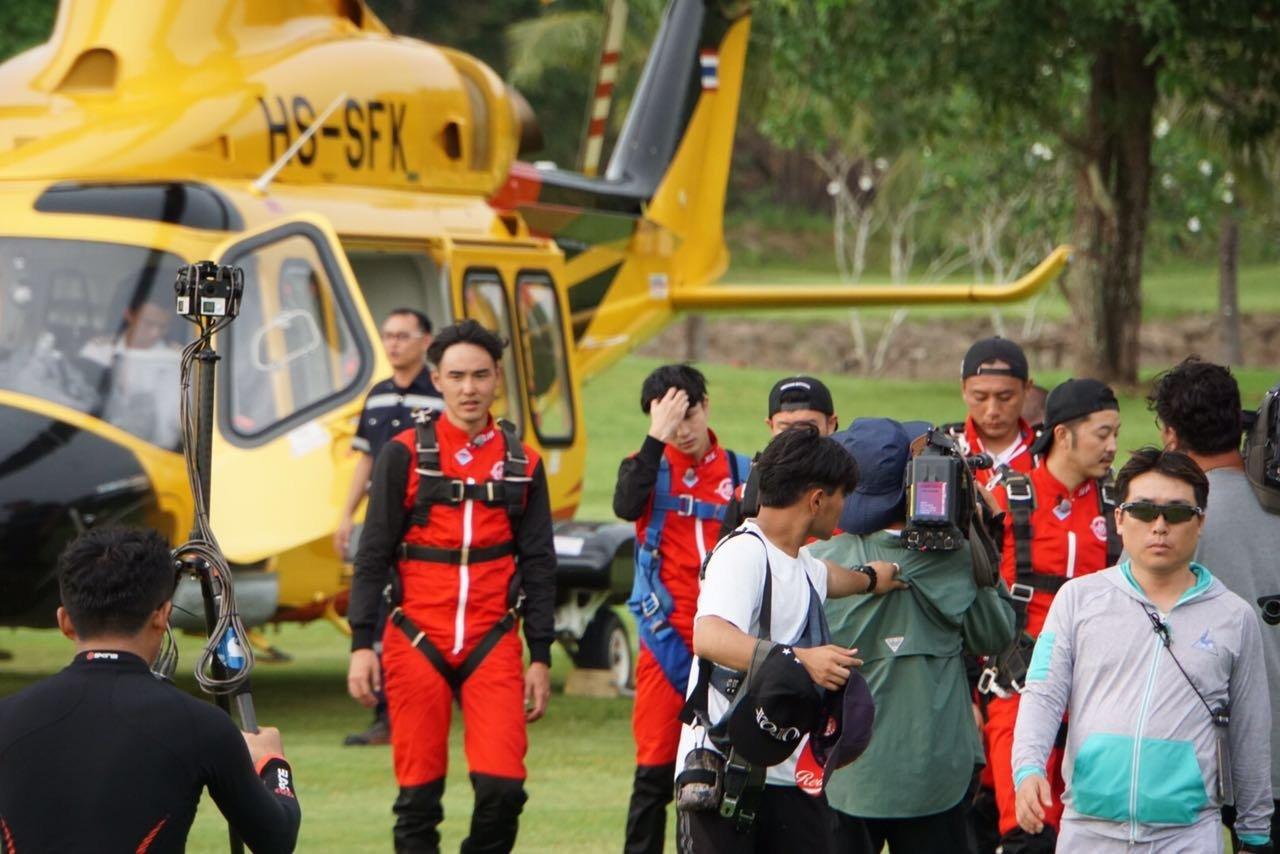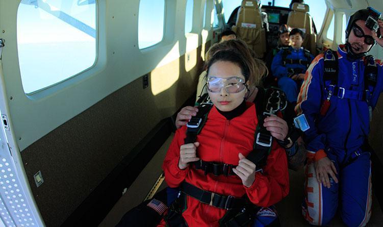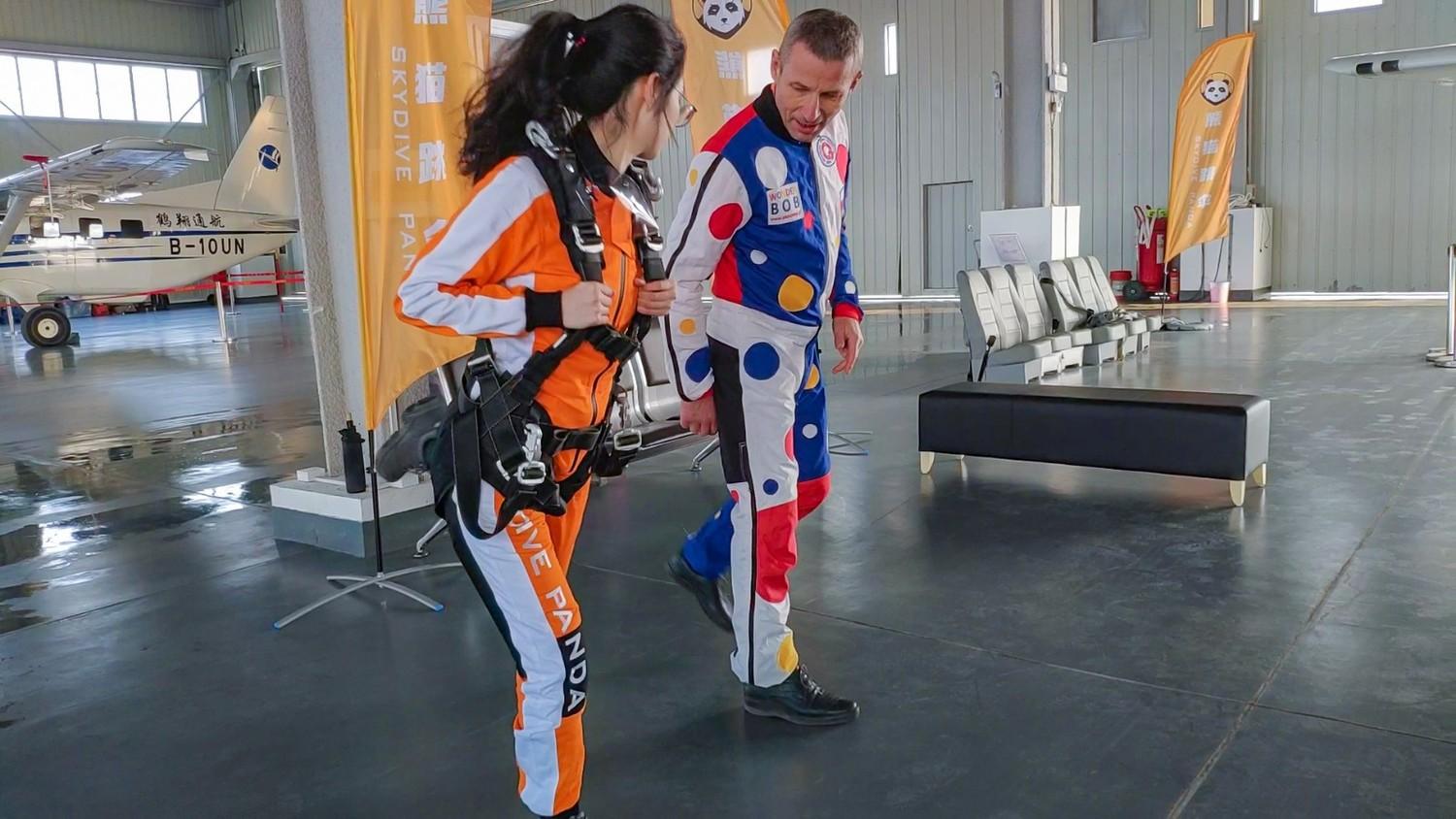 登机前教练再次检查装备,和教练、摄像一起登机,眼看着窗外的景色慢慢变小,凌驾于云层之上。