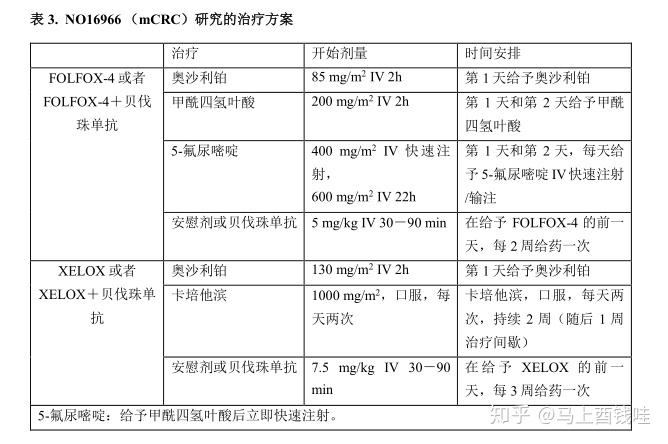 · NO16966:贝伐珠单抗7.5mg/kg体重,每3周给yao一次,同时口服卡培他滨和静脉输注奥沙利铂(XELOX),或者贝伐珠单抗5mg/kg体重,每2周给yao一次,同时静脉给予奥沙利铂,甲酰四氢叶酸加5-氟尿嘧啶快速注射,随后给予5-氟尿嘧啶静脉输注(FOLFOX-4)。酸和5-氟尿嘧啶快速注射,随后给予5-氟尿嘧啶静脉输注(FOLFOX-4)。