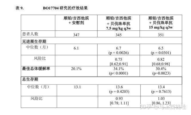 78%(107/138)贝伐珠单抗治疗组患者在第7个周期继续接受贝伐珠单抗单yao治疗,57%(78/138)安慰剂组患者在第7个周期继续接受安慰剂单yao治疗。疗效结果见表10。
