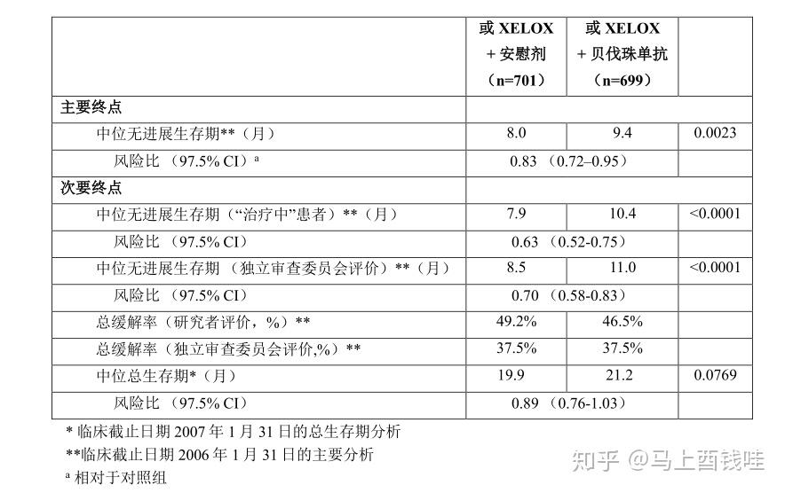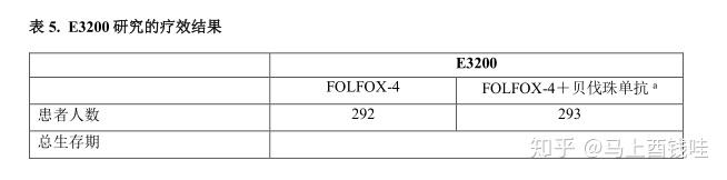 研究结果显示接受贝伐珠单抗单yao治疗的患者与接受FOLFOX-4治疗的患者的总生存期没有显著性差异。而贝伐珠单抗单yao治疗组的无进展生存期和客观缓解率均低于FOLFOX-4组。