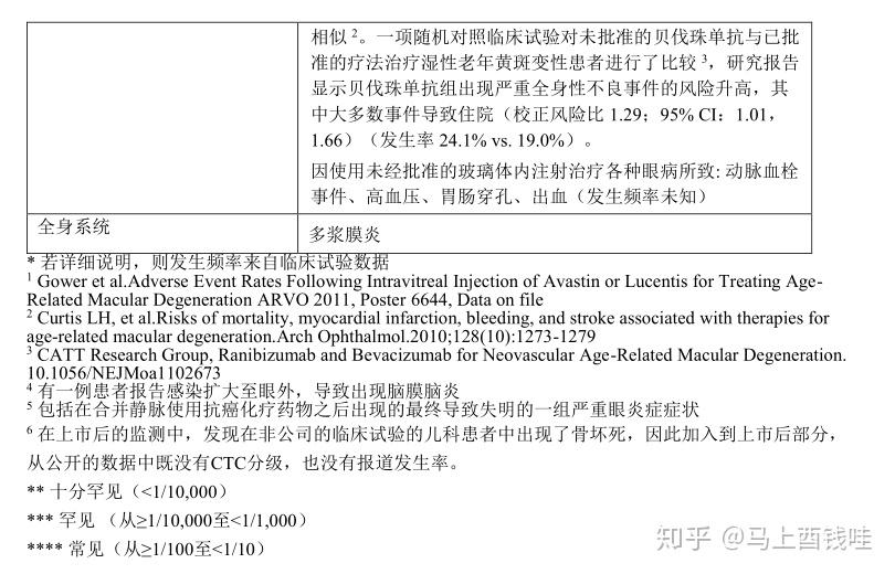 另外三项贝伐珠单抗用于转移性结直肠癌的一线治疗(NO16966)和二线治疗(E3200)的研究中,以及既往接受贝伐珠单抗治疗的患者在一线治疗出现疾病进展后进行二线治疗(ML18147)。在上述研究中,按以下给yao方案给予贝伐珠单抗:与FOLFOX-4(5FU/LV/奥沙利铂)、XELOX(卡培他滨/奥沙利铂)以及氟嘧啶/伊立替康和氟嘧啶/奥沙利铂合用。