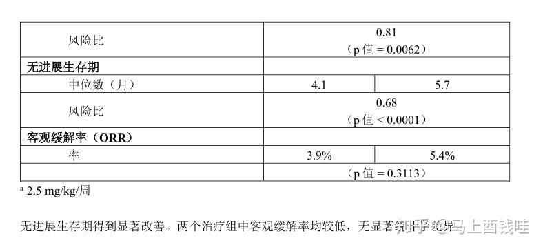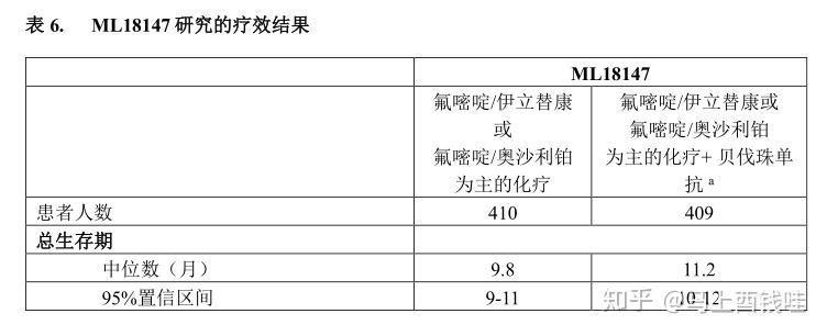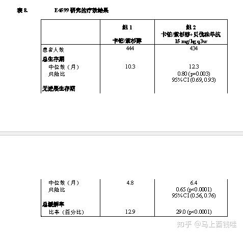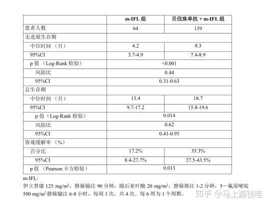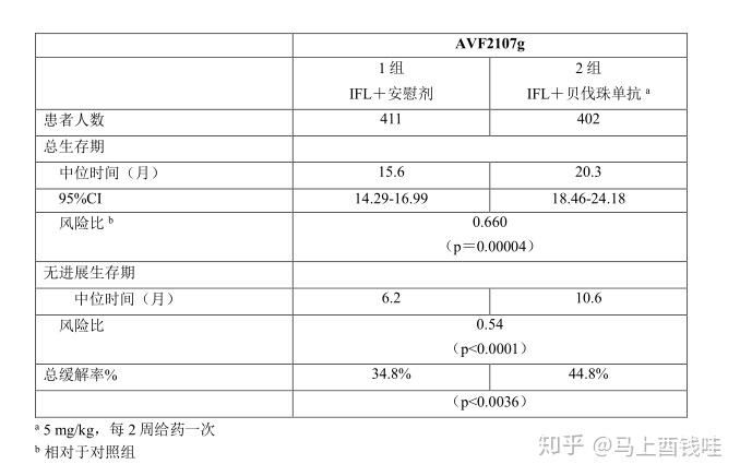 在终止入组之前被随机分配到3组(5-FU/LV+贝伐珠单抗)的110名患者中,总体的中位生存期是18.3个月,中位无进展生存期是8.8个月。