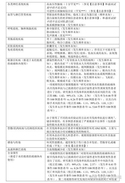 在每个频率分组中,按照严重性降序排列。虽然某些不良反应是化疗中常见的反应(例如采用卡培他滨治疗时发生的手足综合征,以及采用紫杉醇或奥沙利铂治疗时发生的外周感觉神经病变),但是,不能排除贝伐珠单抗治疗使反应加重的可能性。