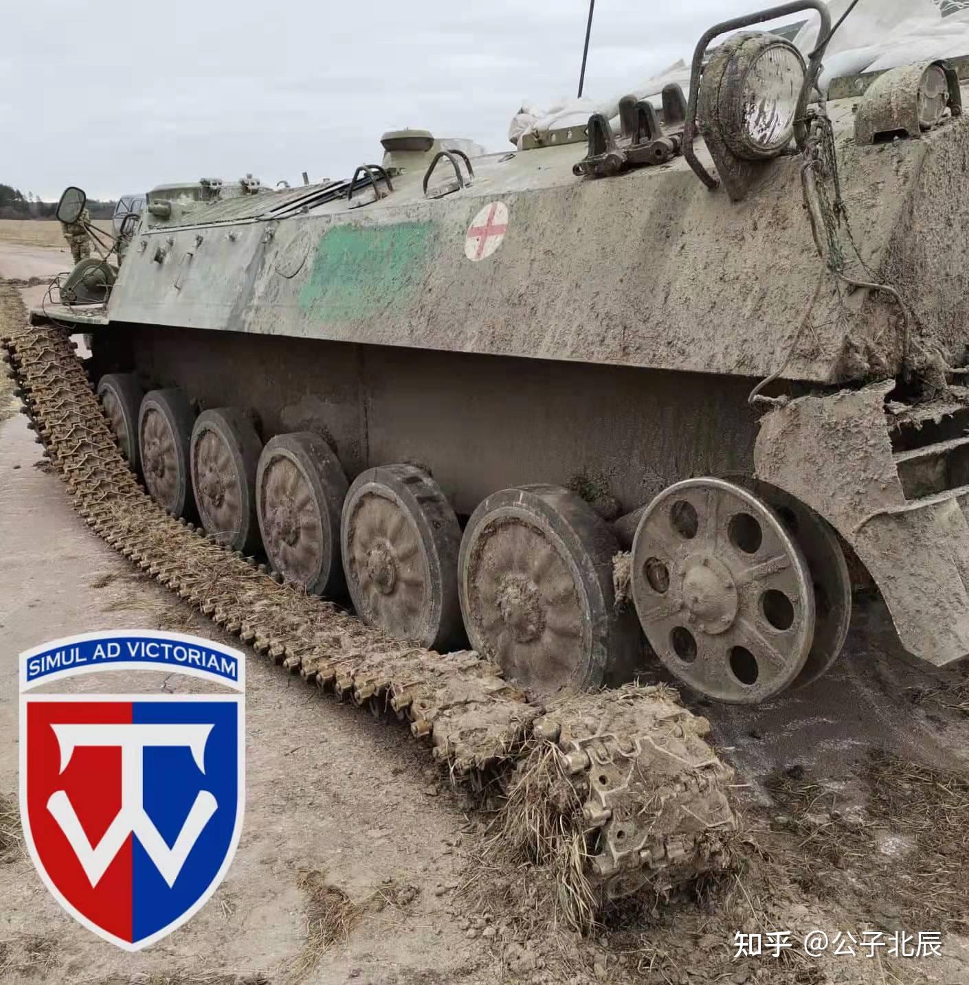一辆被缴获的MT-LB,车身上有红十字,可能是用作运输伤员等医疗用途。该车履带被炸断,应该是俄军遇袭后弃车。
