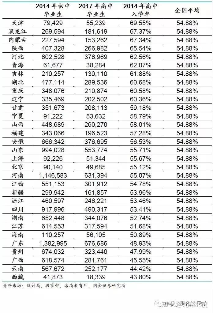 高中入学率,一方面代表户口的限制,竞争的激烈程度,另一方面也反映中学建设的发展程度,*,云南,广西等地高中入学率显著低于平均,很重要的原因就是当地中学建设本来也有些缺失,导致高中升学率较低。