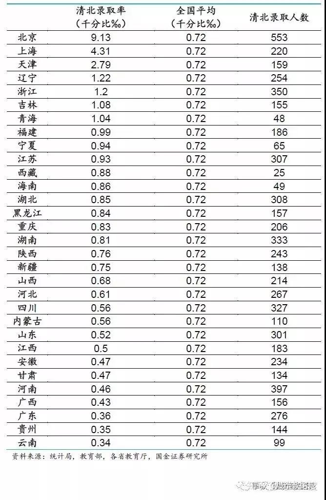 清北录取率:指该省所有高考考生中,被清华北大录取的人数比例。这个数主要包括高考渠道(包括自招加分)进入清华北大的人数,还有一些特殊入学方式(比如推荐,运动员,外国人)等方式没有计入内,所以比总清华北大入学人数应该会少一点。清北录取率这个各省市方差过大,对比起来相对比较困难,我们不计入总分,但我们也列出数据权做参考。清北录取率这个单位不是百分之%,而是千分之‰。