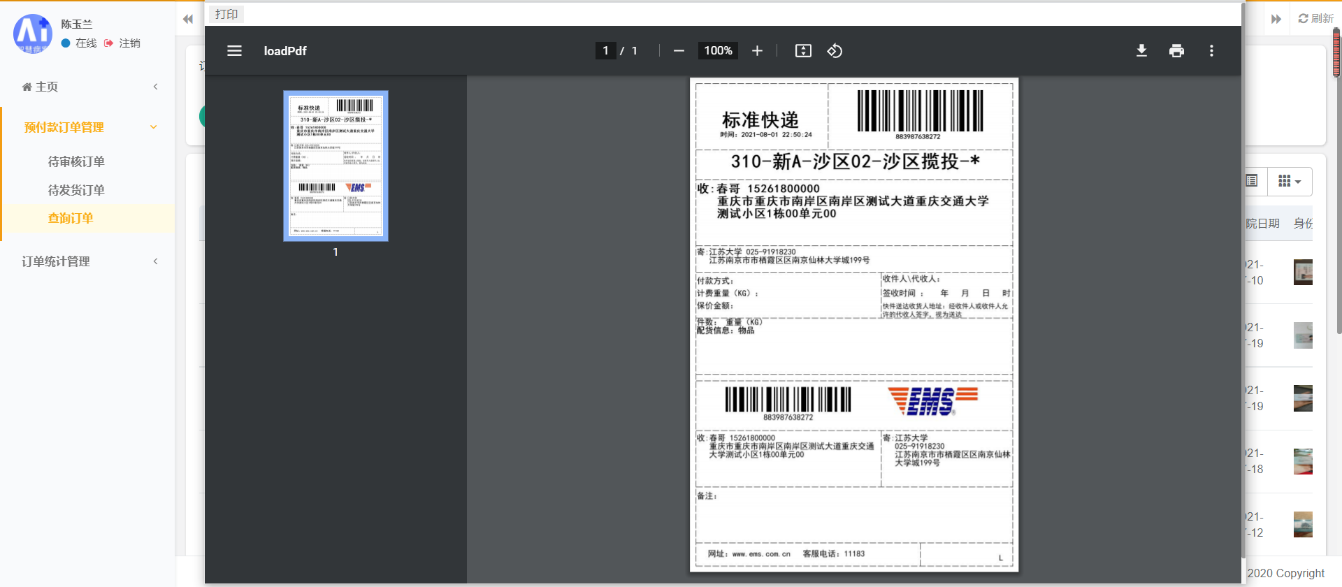 在网站查找了好久关于EMS面单实现的资料分享很少,只能死磕,最后还是实现了。这里把整个实现流程分享出来,这是最终实现的效果图片
