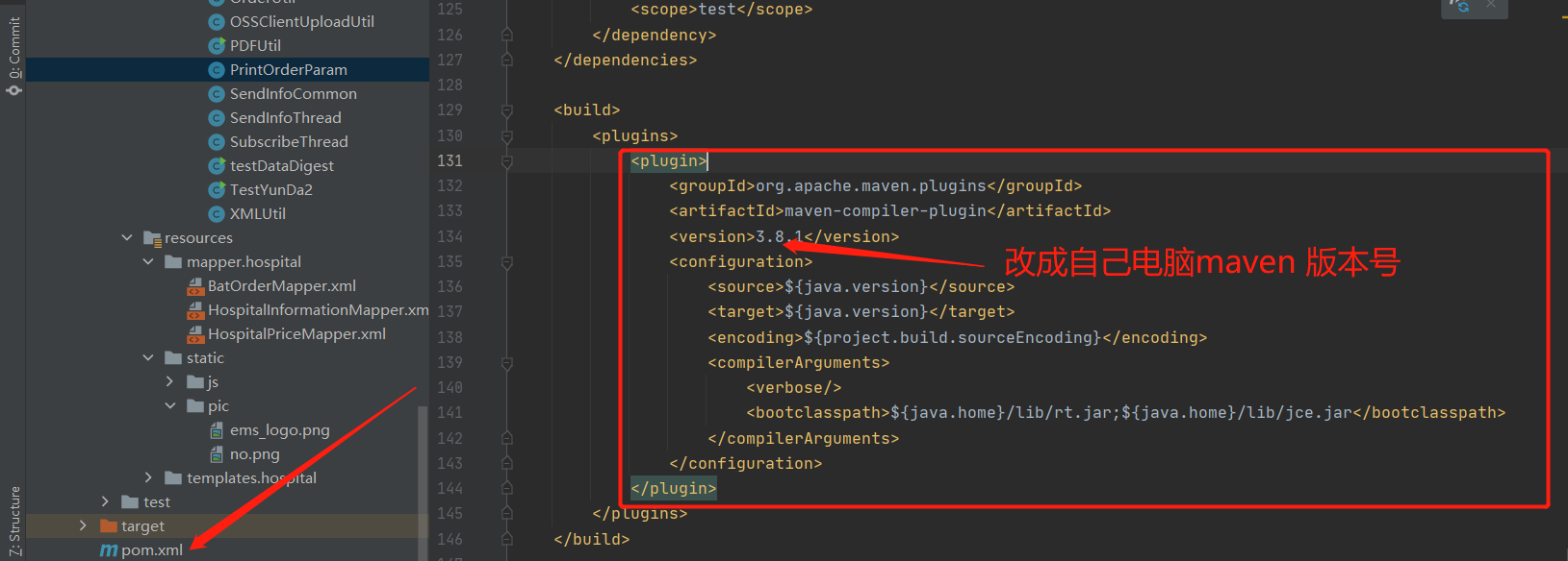 <plugin> <groupId>org.apache.maven.plugins</groupId> <artifactId>maven-compiler-plugin</artifactId> <!--改成自己本机maven版本号---> <version>3.8.1</version> <configuration> <source>${java.version}</source> <target>${java.version}</target> <encoding>${project.build.sourceEncoding}</encoding> <compilerArguments> <verbose/> <bootclasspath>${java.home}/lib/rt.jar;${java.home}/lib/jce.jar</bootclasspath> </compilerArguments> </configuration> </plugin>注意2、