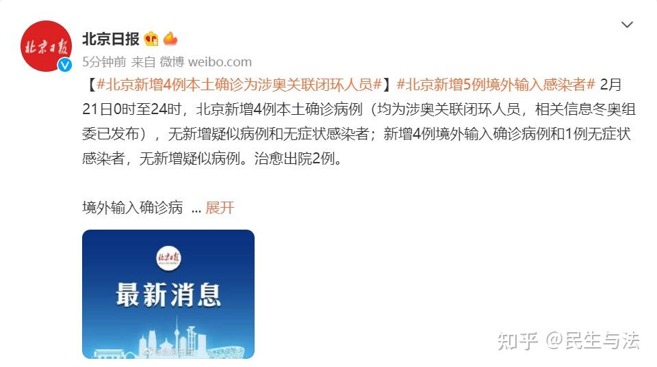 2月21日0时至24时,北京新增4例本土确诊病例(均为涉奥关联闭环人员,相关信息冬奥组委已发布),无新增疑似病例和无症状感染者;新增4例境外输入确诊病例和1例无症状感染者,无新增疑似病例。治愈出院2例。