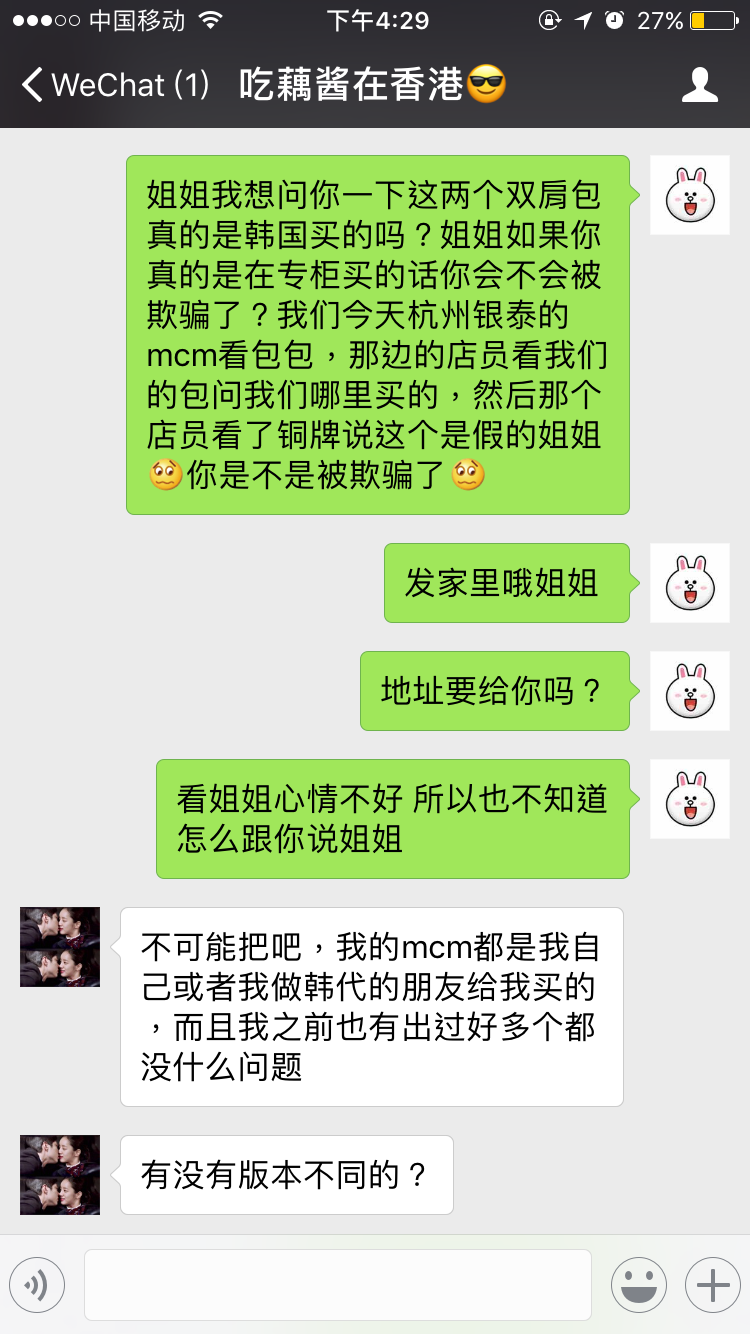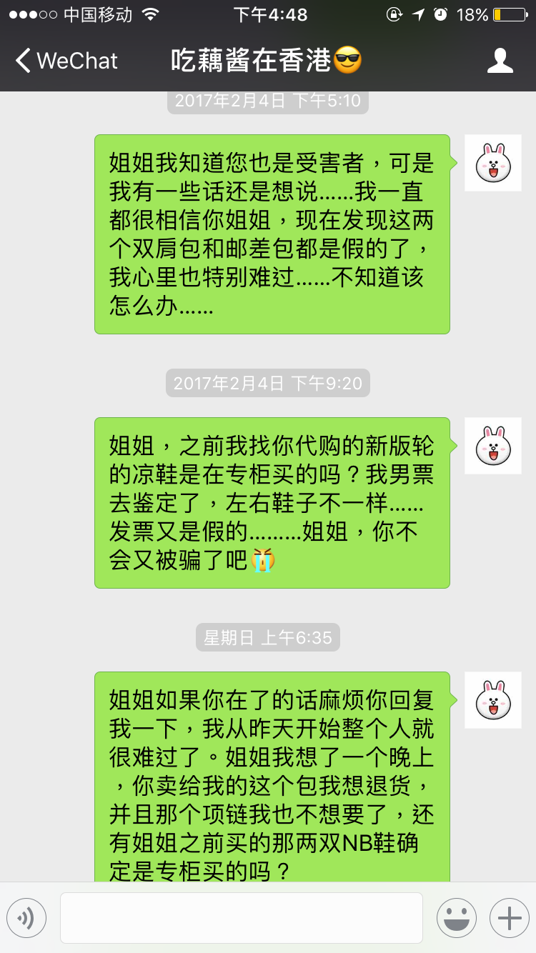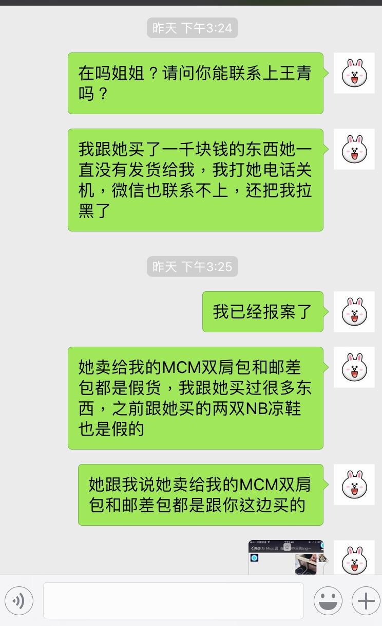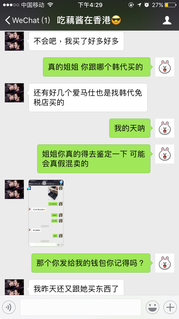 自从被骗之后我就删掉了所有的代购除了一个一直买的跟我年纪一样的韩国代购。在她那买的东西没有那个骗子王青那边多,大概加起来也就两千多RMB,之一次买了帆布包因为货丢了她就给我退款了,后来一次我买了面膜她发给我的不是我想要的那款也给我退货了,还一直跟我抱歉,后来给我去找line手机壳,买羽绒服什么的,都现场拍照片给我看,钱也可以晚些给她,不用先款,她也有自己的淘宝店,所以我就一直挺信任她的。