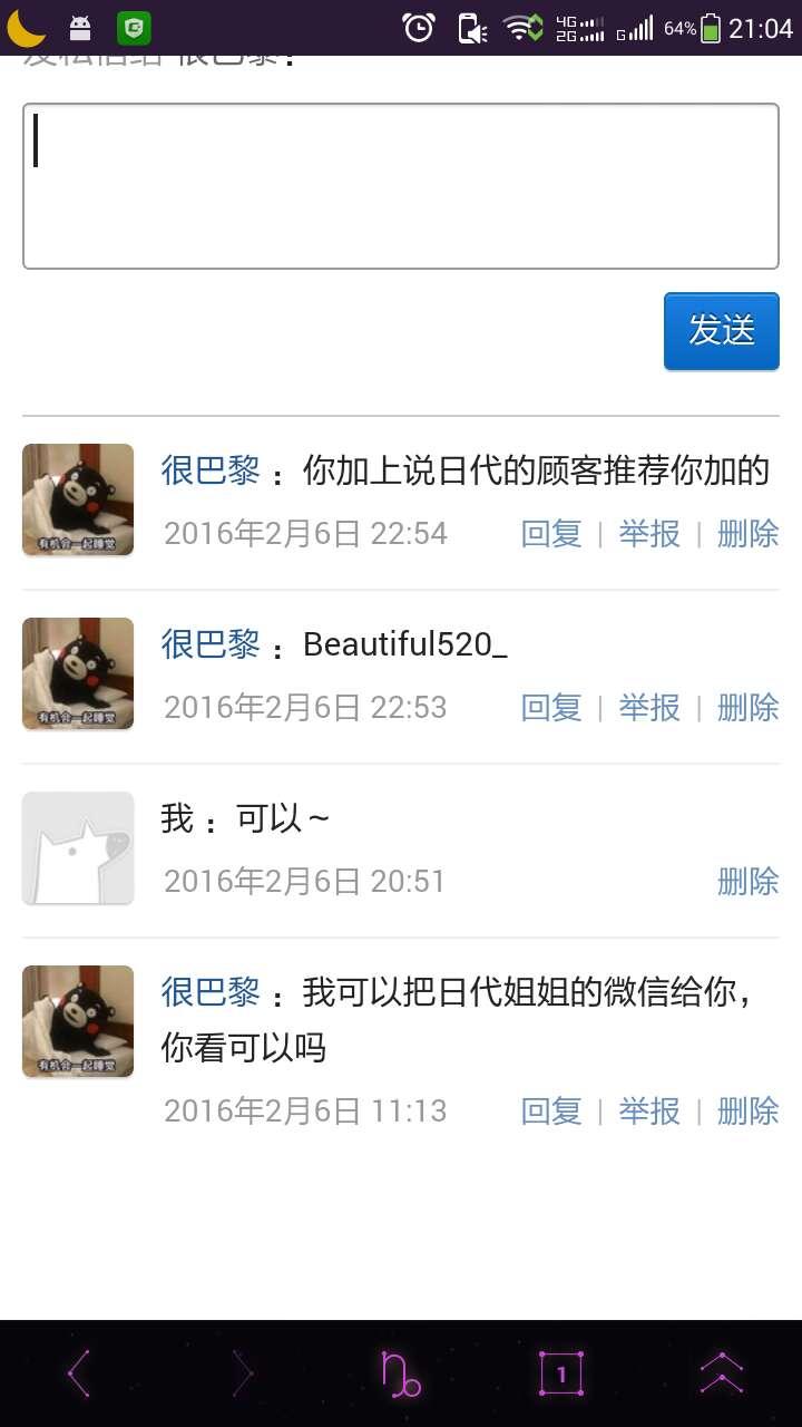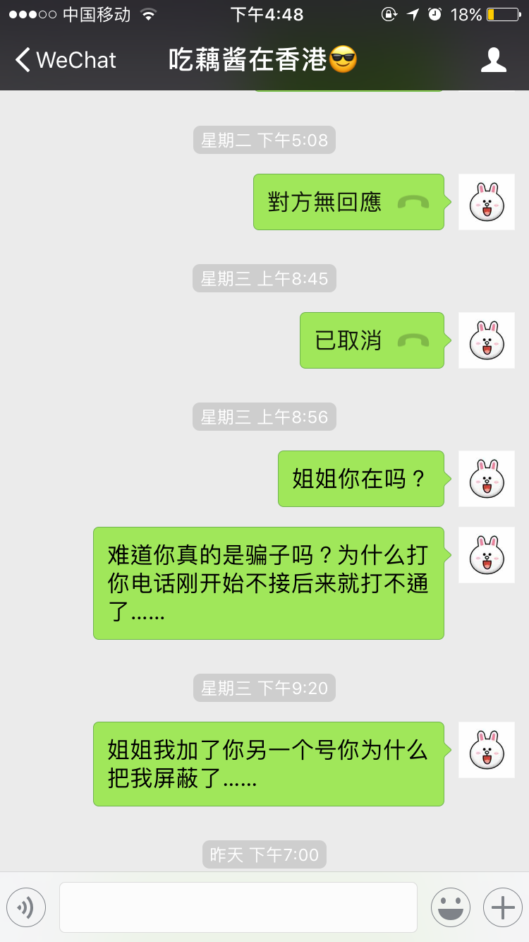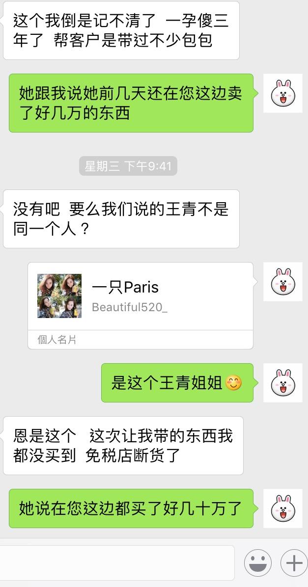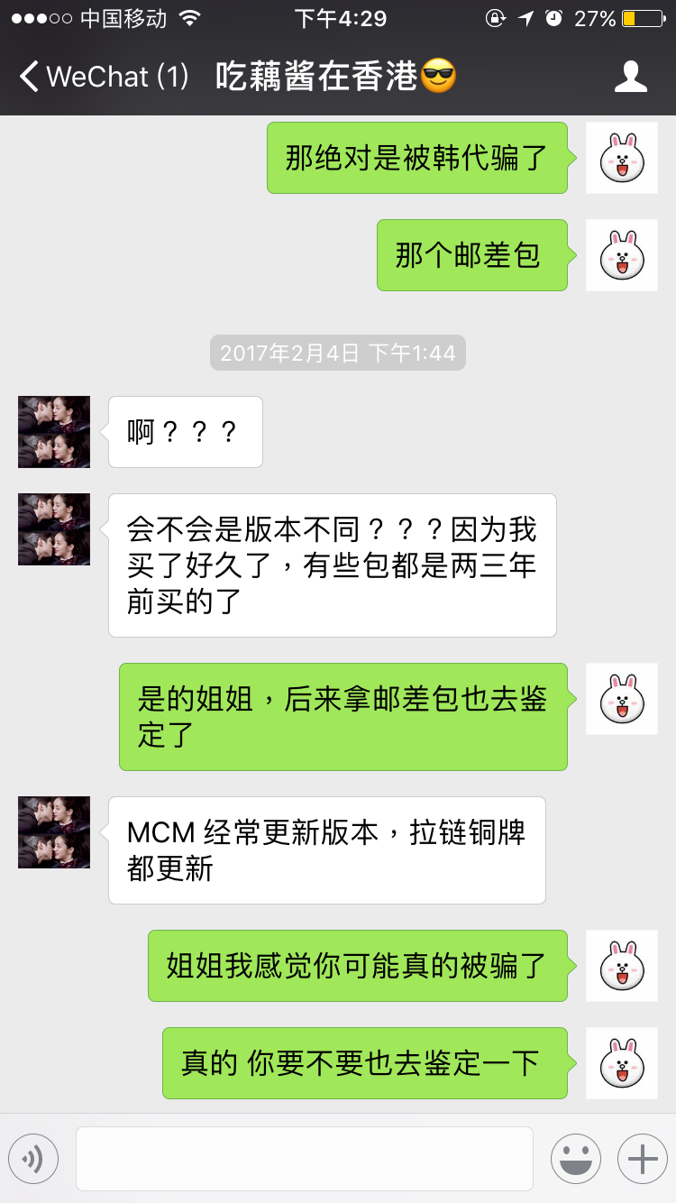 自从被骗之后我就删掉了所有的代购除了一个一直买的跟我年纪一样的韩国代购。在她那买的东西没有那个骗子王青那边多,大概加起来也就两千多RMB,之一次买了帆布包因为货丢了她就给我退款了,后来一次我买了面膜她发给我的不是我想要的那款也给我退货了,还一直跟我抱歉,后来给我去找line手机壳,买羽绒服什么的,都现场拍照片给我看,钱也可以晚些给她,不用先款,她也有自己的淘宝店,所以我就一直挺信任她的。