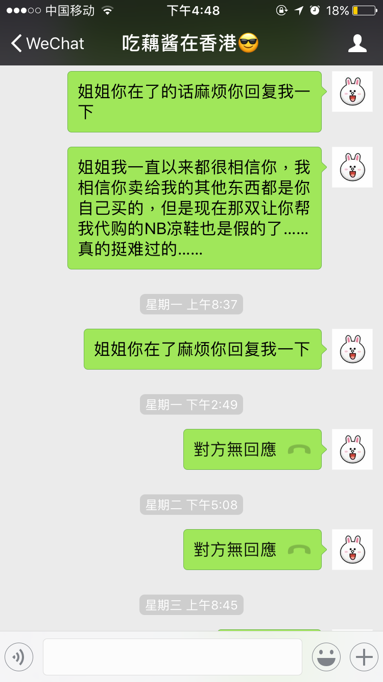 后来想买一双NB的凉鞋,问韩国姐姐说韩国已经下架了,室友说可以问问香港代购,我就问她了,她说要等,专柜可以调到货,于是我等了差不多有两个月。