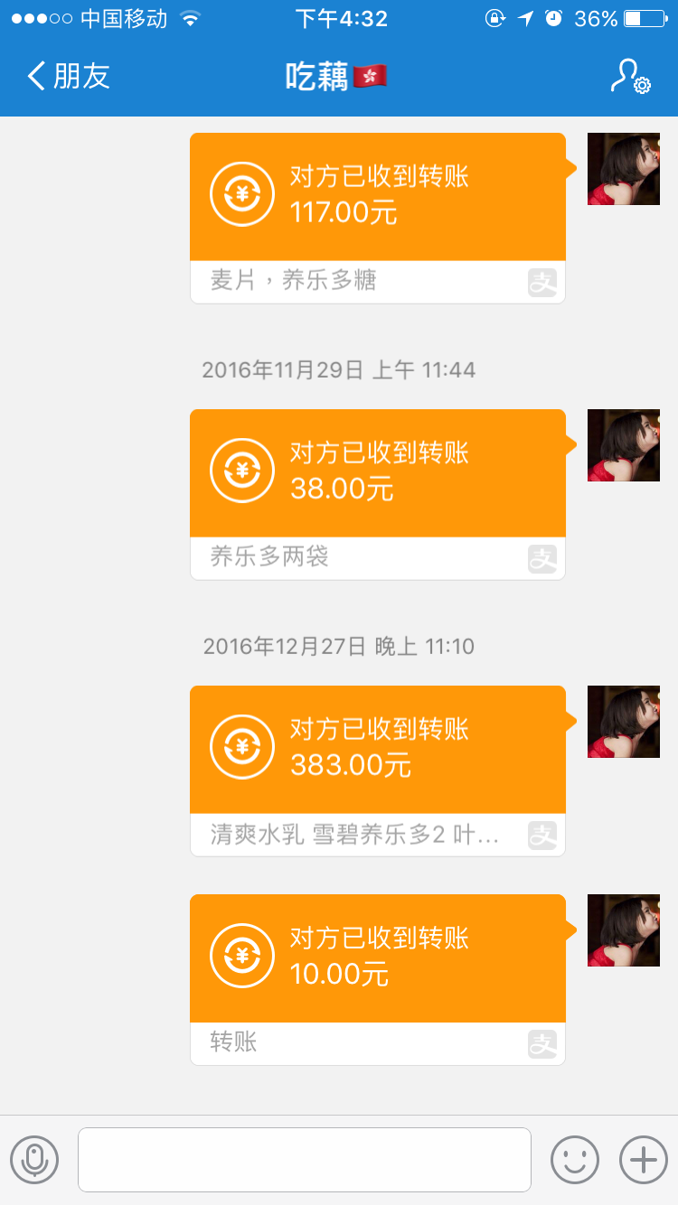 之一次是帮我室友买了薏仁水,因为我的室友也经常跟她买所以我一直都挺相信她的。
