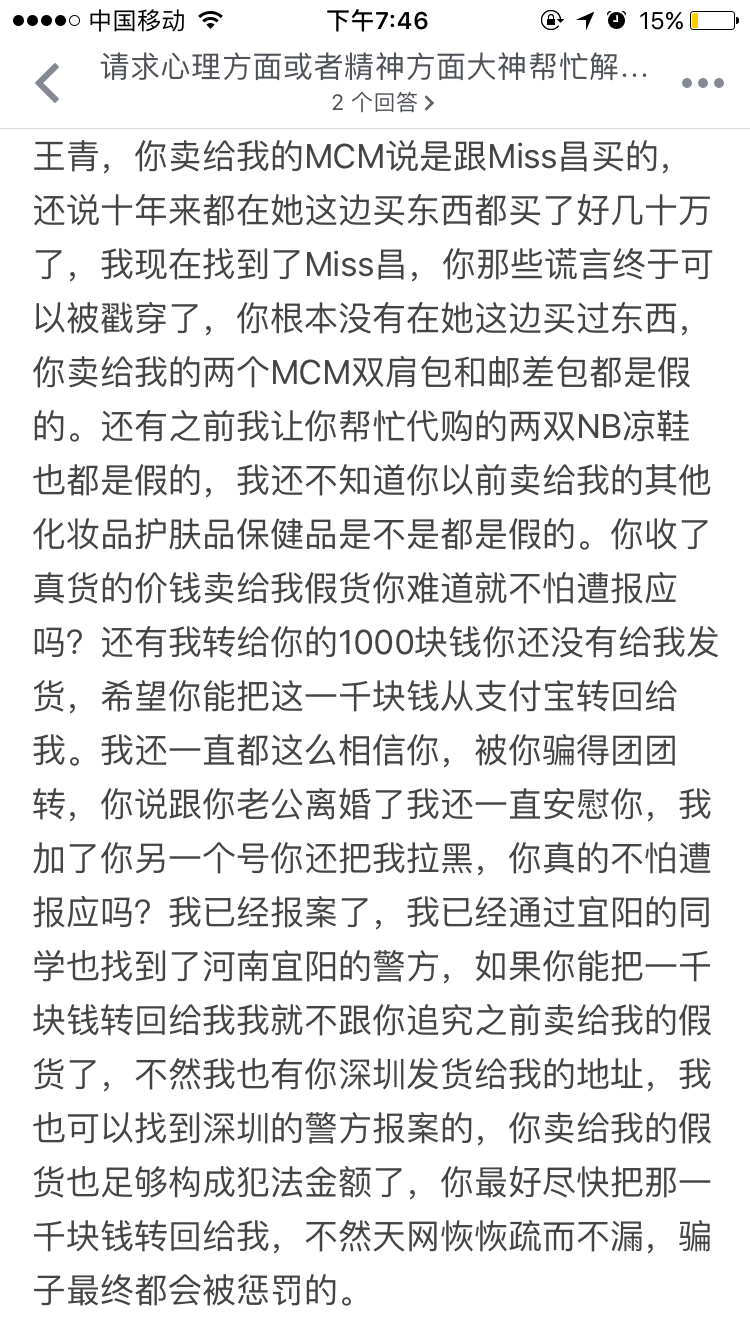 对了买包的时候还跟她买了一根1000RMB的项链,直到现在也没有给我发货,之后就再也联系不上了。(这一千块钱经过我男票和我还有同学朋友等齐心努力,追了回来!简直是奇迹!过程我在下文慢慢写)