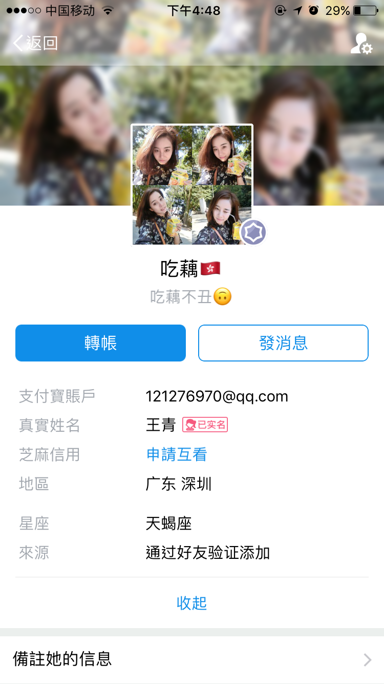 这个是她的代购号:这个是她的另一个号(我根据她支付宝上的QQ号加到的,刚加就被她拉黑名单了)