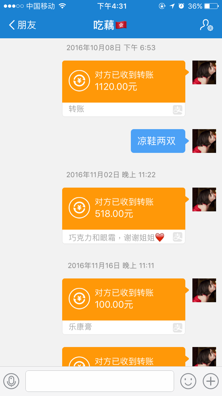 还有还有就算被骗了也不要绝望,要想尽一切办法收集骗子的信息,知道的越多对你越有利,像我这样通过她的支付宝账号最后也逼迫她转回来了一千块钱!一千块也是钱啊!今天先写到这边,案子有进展再继续更,如果知乎上有大神认识这个人请务必告诉我!如果知乎上有人也是她的客户请一定要警惕这个骗子!
