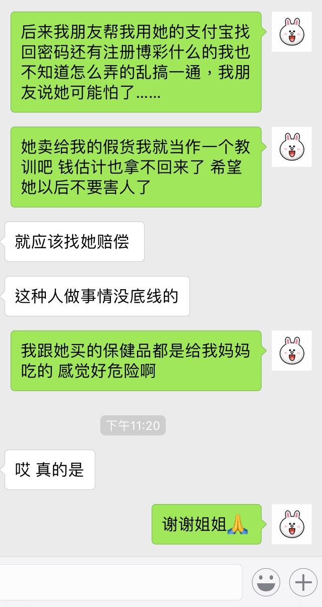 她发现我相信她也是受害者之后,利用我的心肠软等蠢货的品质继续跟我假装她在那个所谓的韩代那买了很多的东西,并且装出自己也被骗后的可怜……(如果是正常人就应该选择跟她撕B而不是像我这么蠢还相信她!!!)