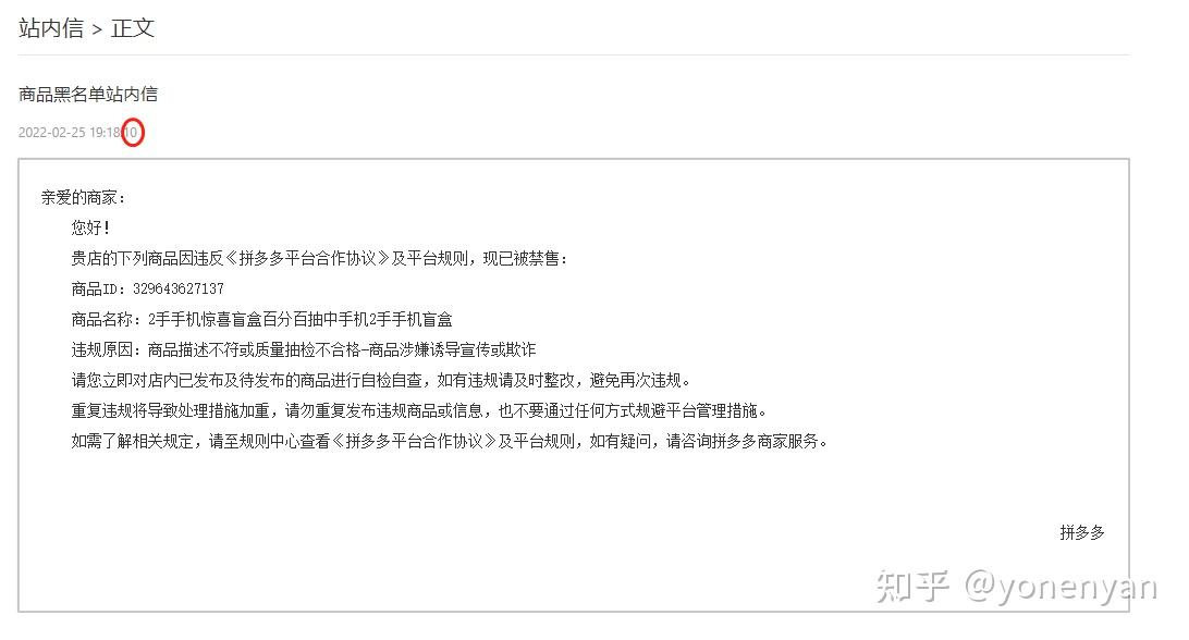 2022年2月25日晚19:18:05秒(商品黑名单站内信显示的是19:18:10秒,错十秒)又通知原告商品”2手手机惊喜盲盒百分百抽手机2手手机盲盒”(商品ID:329643627137)”商品描述不符或质量抽检不合格--商品涉嫌诱导宣传或欺诈”。