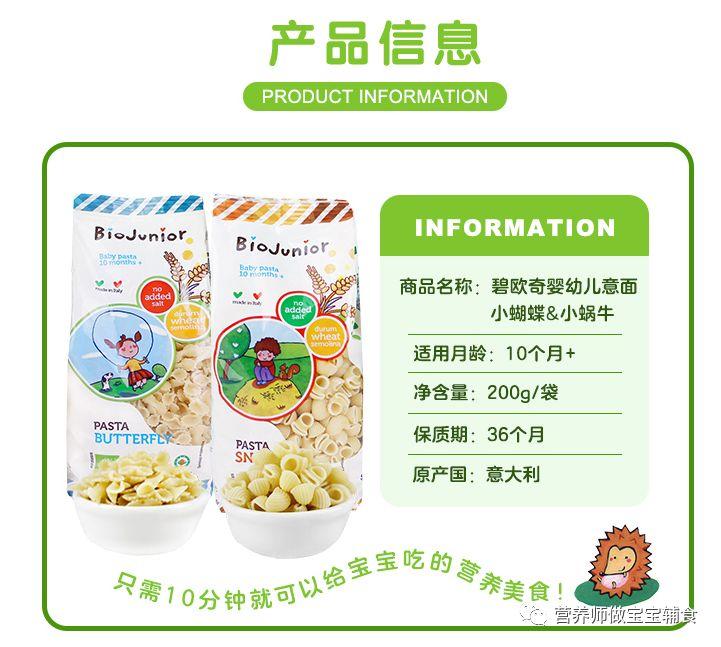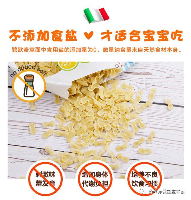 1、意大利原装进口,纯天然有机食品,真正无盐无添加:这款意面是意大利品牌碧欧奇Biojunior,它家被誉为“宝宝的有机食品专家”,品质要求高,从配料表可以看出它只有硬质小麦粉和营养补充剂,无盐无添加剂,更合适宝宝食用,符合国际婴童食品行业标准;
