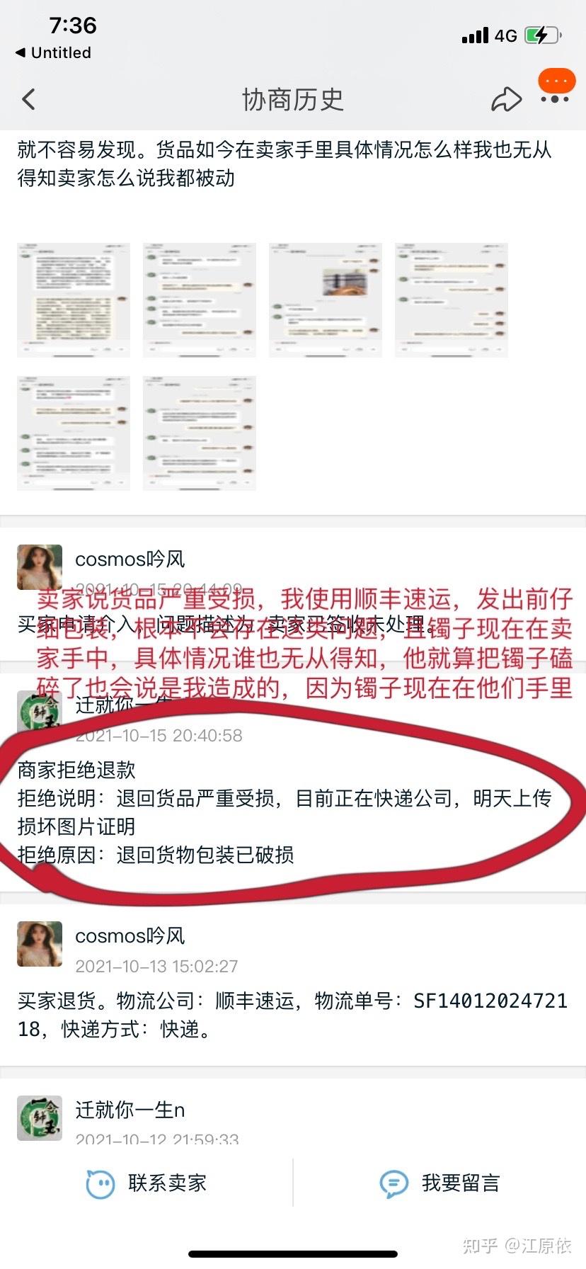 十月上旬,于淘宝,店铺名:一念钟玉,购买一支价格为6290的和田玉白手镯,10号物流派送签收,因为我收获地我写的学校,那天正好周天,我不在学校,11号下午拿到货,12号仔细查看镯子发现有一处很小的瑕疵,之前也买过很多镯子,对和田玉镯也有一定的了解,我认为这是打磨问题,然后拍了图片找商家核实,商家说应该是没有打磨好,那我说你再给重新打磨一下,他说必须得确认收货才行,这个处理方式我不太满意,这个时候我已经不想要这个镯子了,我不认可这家店铺,然后申请退货退款,这个商家就问我说,姐你怎么申请退货退款了,然后我就没有怎么理他,商家收到货之后给我打了两个电话,那天正好是周五,我在开会没有接,看到他在淘宝给我发消息,我就回了,商家拒绝退款,说这个泛白的地方是人为刮花,我肯定接受不了然后,然后他说我这边有快递发出之前的细节图,能够证明镯子在他那边出去是完好的,他的意思是我造成的,或者说是我这边快递员造成的,然后就申请淘宝小二介入开始了漫漫的 *** 之路。