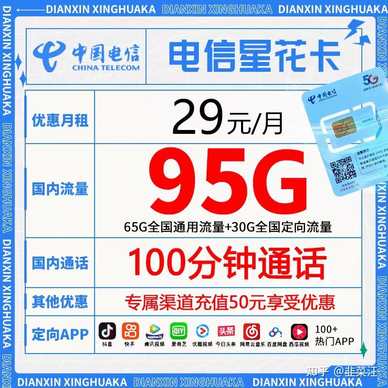 【长期】电信星花卡29元95GB全国流量+100分钟通话
