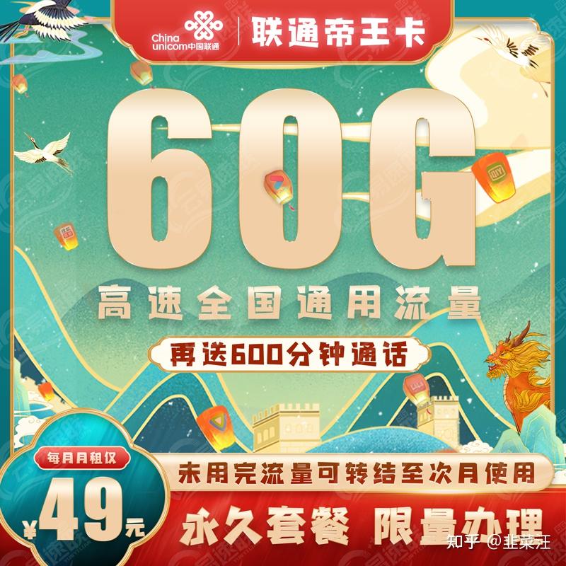 【永久】联通帝王卡永久49元60GB+600分钟+ *** 餐可转结