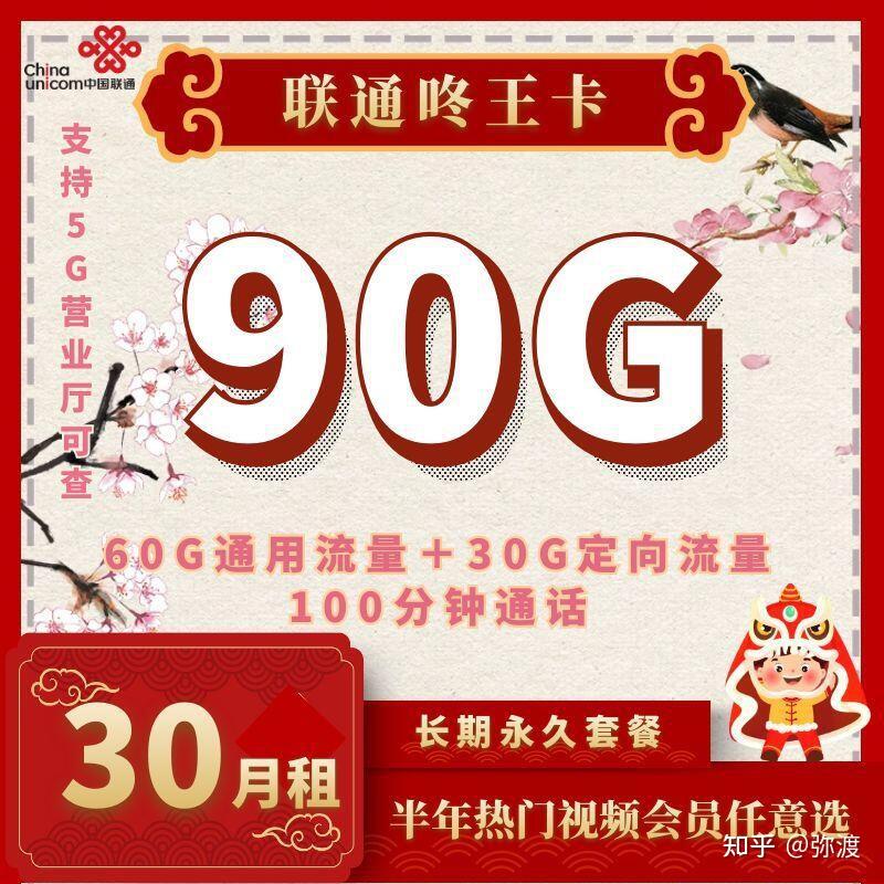· 联通咚王卡套餐/30月租60G通用流量+30定向流量+100分钟通话+全国可发