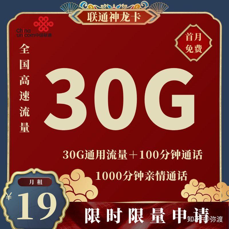 · 联通神龙卡/19元包30G全国通用流量(可转结)+100分钟通话+0.15/分钟+1000分钟亲情通话