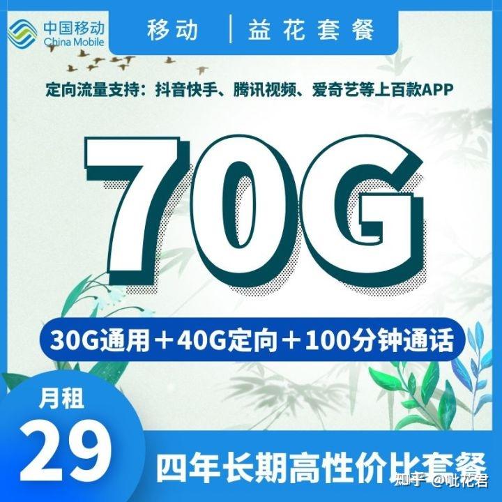 · 移动益花套餐详情:29月租包30G高速通用流量+40G定向流量+100分钟通话+视频会员(四年优惠)