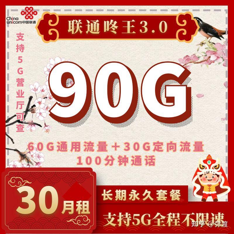 · 联通咚王3.0套餐/30月租包60G国内通用流量+30G国内定向流量+100分钟国内通话(长期)