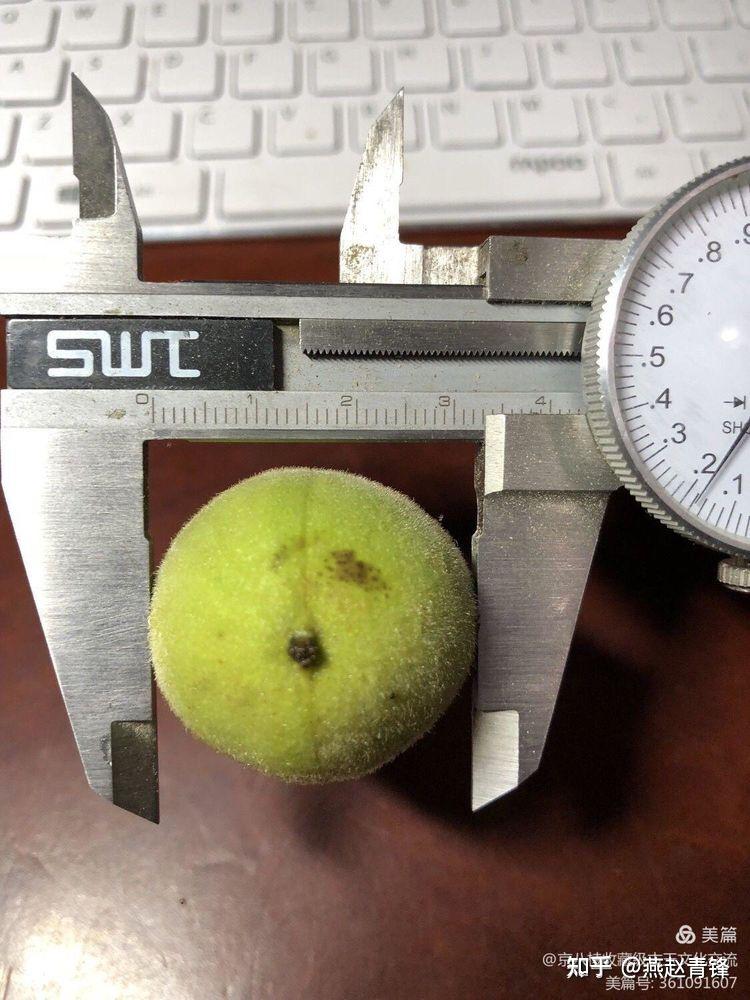 按照上述原理,见图即明,这几个楸子是高桩,切开后测量,壳23毫米,青皮33毫米,单边5亳米,这也表明了今年雨水充沛,壳和皮水粉吸收充足,个大皮厚。通过上述方式,可以在树下预判桩型,当桩型为矮桩时,我们摘下一个看青皮,可以预判内部果实尺寸和是否端肩等,这就是抢青的入门级水平了。