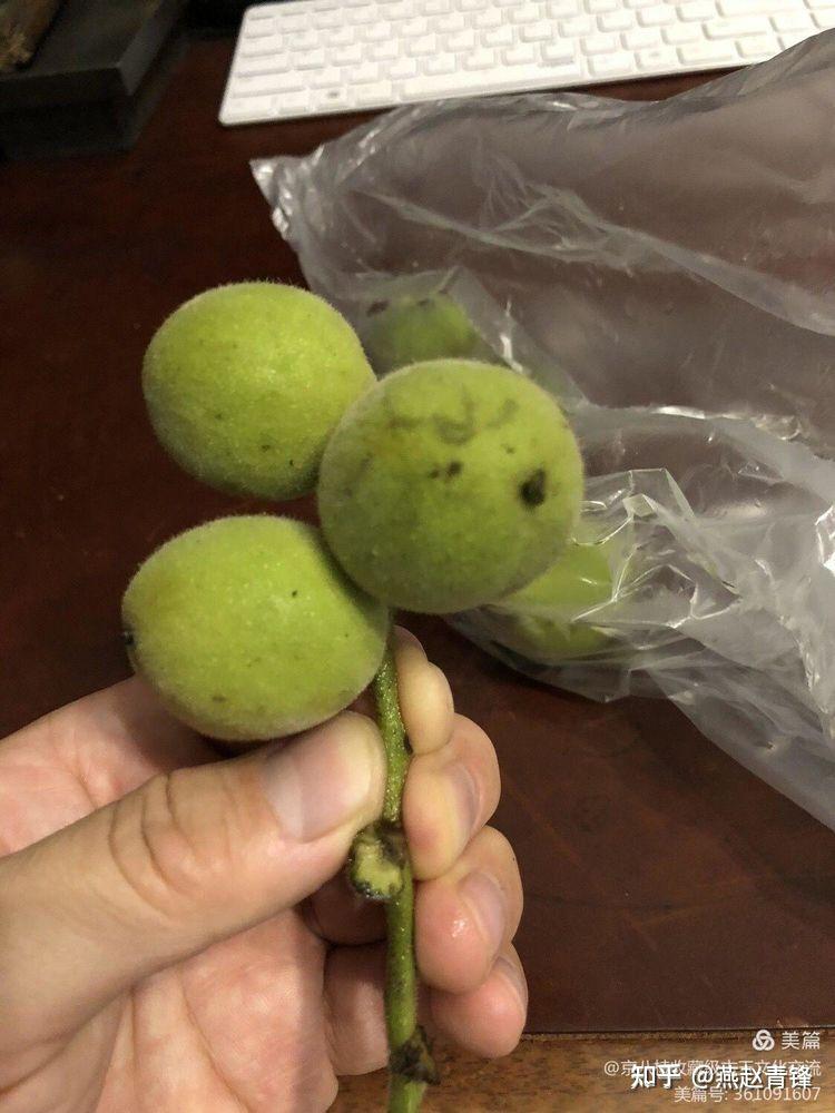 这棵树被很多山民惦记着,都想拥为己有,正是这种现状,我也经常遇到认识的山民,他们连我也不放过,东拉西扯的想套我的话,真是费尽心机了,其实我也是和他们一样,被真正的树主所防范,七月底的一天,树主来电,大哥你在青龙吗?后天早上十点左右下树,你来吗?我说在北京,明天晚上可以入住青龙酒店,第二天早上九点多可以去他家拿货,就这样约好了,我如期到达酒店,一夜无梦到天明,天气突变,从凌晨开始下雨,中雨级别到早上未停,本想电话告之可以晚些下树,毕竟雨中上山太危险了,可是又想这种事情还是由他自己定夺为好,也就没有联系,九点半左右,电话如期而至:“大哥,你来吧,我冒雨上山摘下来了,一百多个果,我在家等你”。我当既开车前往,下车进屋,雨水已湿衣衫,进屋擦拭眼镜的功夫,他已经拿出一个塑料袋,里面装满了小核桃青皮,塑料袋上有些许水滴,奇怪的是袋内的果实未见雨水迹象,赌过青皮的朋友都知道,青皮上有细毛和沾液,挂上雨水是很难快速清干的,我用手摸了一下青皮,略带凉意,嘴上边说,雨中上山太危险了,何必这么着急,他说没办法,雨中上山没人跟踪,我笑着回应着,通过观察可以知道,这个青皮应该是他之一次电话时就已经放在他的冰箱或者地窖里了,没有办法,谁都得防着是他们的现实状态,哈哈。