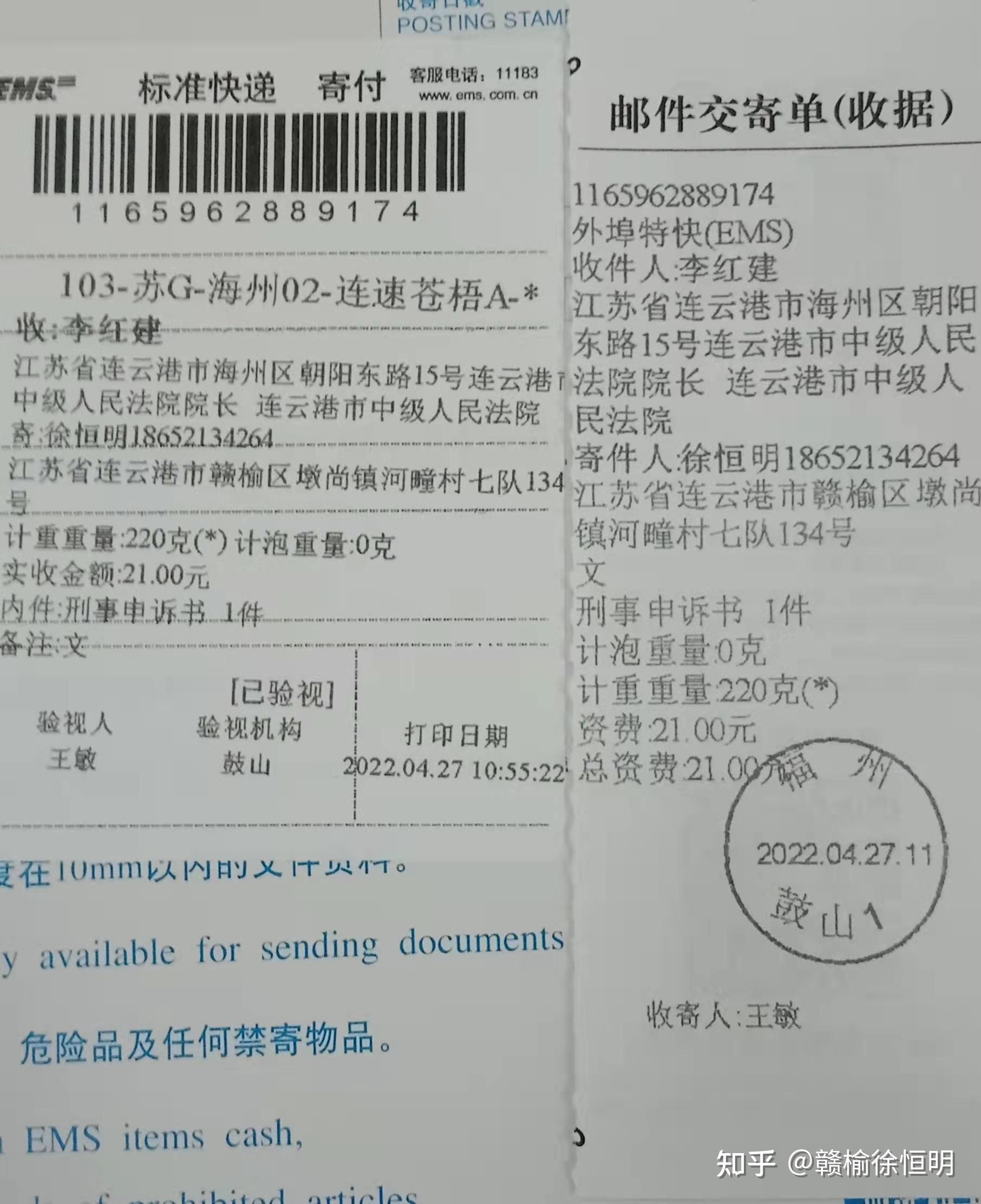 2022年4月22日,江苏省高级人民法院涉诉 *** 办公室寄给申诉的(2022)苏访08507号通知书,申诉人5月8日收到,得知先向4月27日通过EMS向连云港市中级人民法院院长李红建邮寄刑事申诉书,邮政快递单号是:1165962889174,连云港市中级人民法院提出申诉,故特具申诉状,请求为申诉人 *** 纠错。