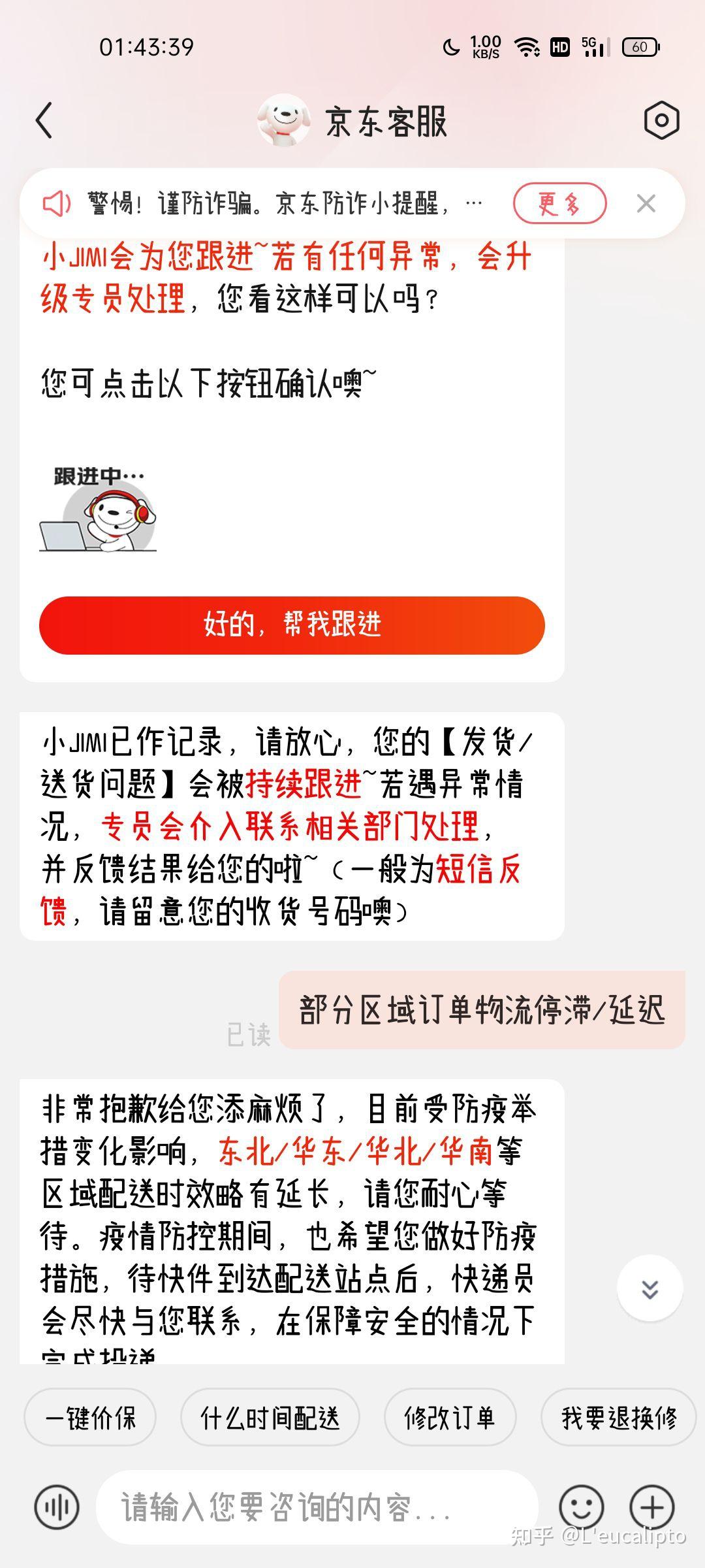 第三点,京东官方客服无人工,虽说疫情下大家各自理解,但是我想了解下我为啥拿不到货总是正常的吧,没有任何解释的一直推迟就离谱。你好歹说一下仓库区有情况发不了也好啊(仓库发不了货还上架卖也是离谱,且没有任何提示)。最后一张图,京东智能客服表示订单跟进反馈给我短信,至今未收到任何解释。