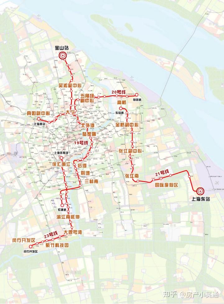 19号线:原规划为虹建路站-宝山站,后增加北延伸段,主要沿铁山路走行,终至富锦路站。弥补浦东滨江地区轨道交通不足的问题,串联了宝山站、北外滩、陆家嘴、后滩、前滩、三林等重点板块。20号线:金昌路站-共青森林公园-新园路站,后增加东延伸段,主要沿洲海路走行,终至新园路站。弥补上海北部副中心间联系不足的问题,串联真如(上海西站)、大宁、五角场、外高桥等上海北部几乎所有的副中心板块。21号线:上海东站-六陈路站-东靖路站,后增加东延伸段,主要沿川南奉公路走行,终至浦东综合交通枢纽。弥补浦东重点产业板块之间联系不足的问题,串联外高桥、金桥副中心、张江、国际旅游度假区(迪士尼)、浦东枢纽等浦东地区最重要的板块。22号线:部分并入26号线网络,其余搁置或放弃。23号线:上海体育场站-闵行开发区站。弥补黄浦江西岸轨道交通短板,从徐家汇出发一路沿黄浦江向南,直至闵行开发区,串联整个黄浦江西岸。除了上述线路建设外,申通集团还展示了一条重磅线路:地铁外环线-26号线。