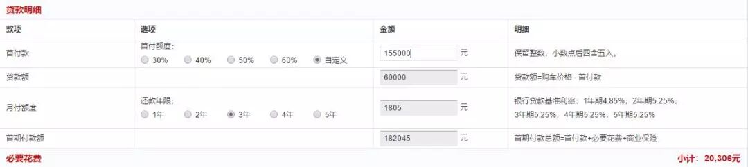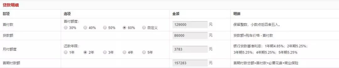 先说两年定额8万6免息的贷款,裸车价格是21.5万元,也就是说首付是12.9万元(接近60%),加上购置税和保险等一些杂费的话,上路大概是16.2万元左右,月供大概是3500元。