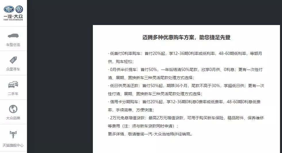 官网金融方案丰富 但审批较慢当然,迈腾也可以享受一汽大众的多种金融贷款,比如说首付50%,0月供,一年后结清尾款;还有首付50%,可以提供更高不超过30%的尾款等多种方案,不过跟高尔夫一样,这些方案的审批会非常麻烦,且审批速度很慢,所以4S店一般都不怎么推荐,而且综合来说并没有比上面几种省很多,只是还款时间和方式有所变化,志鹏觉得并不值得去折腾,你们觉得呢?