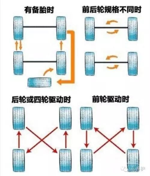 行驶一定里程后调换前后轮胎按照厂家的规定,行驶到一定里程后,要将前后的轮胎互相调换。因为二者的承载重量不等,磨损也不等,这样可以物尽其用,延长轮胎的使用寿命。但是,要注意子午线轮胎和斜交轮胎的更换方式是不同的。前者是前后直线调换,后者是横8字更换。