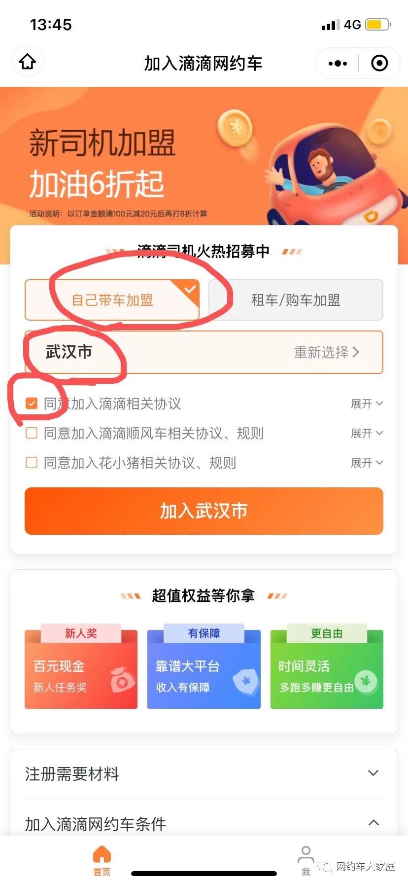 第二步:识别图中二维码进入滴滴注册小程序后,我们选择自己的注册城市,选择自己带车加盟,三个同意选项,都打上勾,就进入拍照页面。 我们跟着提示去正确拍摄证件照片和车辆照片即可!!!