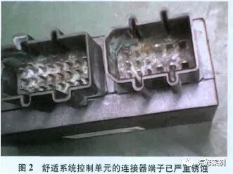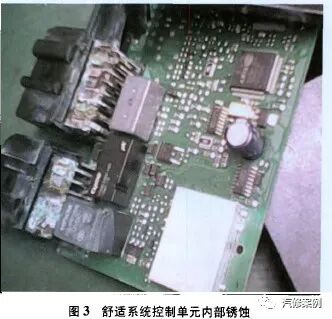 干是决定对舒适系统控制单元进行检查。由于舒适系统控制单元安装在驾驶人侧座椅下,于是拆除驾驶人侧座椅.掀开该侧驾驶人侧座椅下的地毯,将固定在车身地板上的防护罩拆下,却发现防护罩里面有很多积水,而舒适系统控制单元有部分浸泡在水中(图1),怀疑故障是由此造成的。断开舒适系统控制单元的导线侧连接器,发现舒适系统控制单元的连接器端子已严重锈蚀(图2)。检查舒适系统控制单元,发现已经损坏,拆检舒适系统控制单元.发现其内部已锈蚀(图3)。由此可以断定该车的一系列故障应该就是因舒适系统控制单元工作不良引起的.由于舒适系统控制单元浸泡在水中.短路、断路或信号不良等情况均有可能发生,因此产生了相应的故障代码,而故障现象也就多种多样。