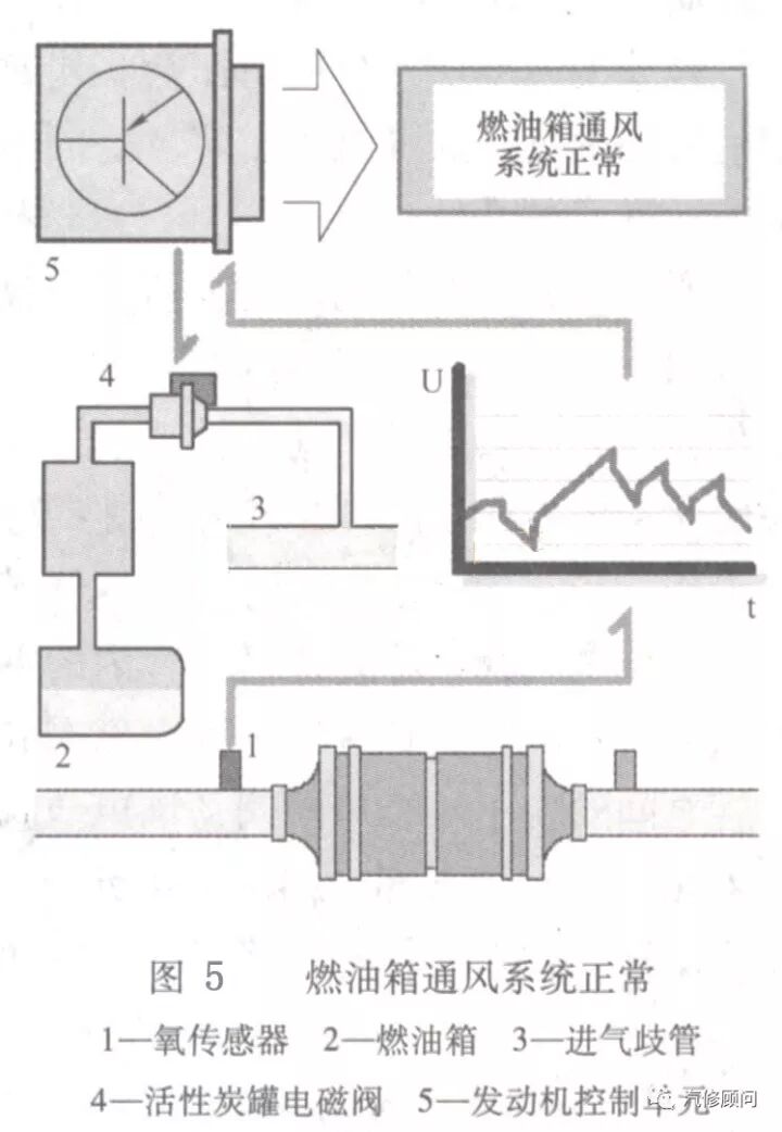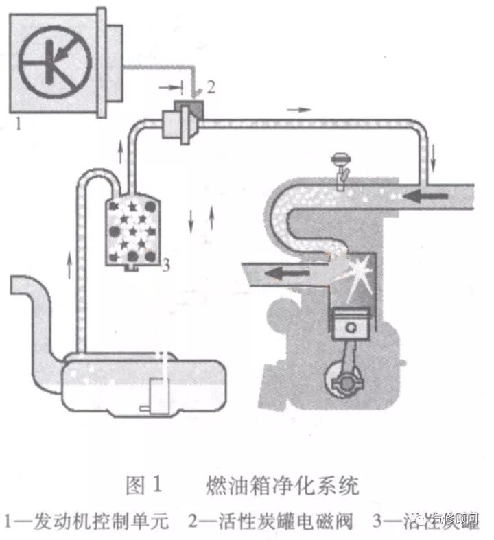 燃油箱通风系统是为防止燃油箱内的燃油蒸气排入大气中而设置的,它利用活性炭的吸附作用,将燃油蒸气存储在活性炭罐中。活性炭罐的出口通过真空软管与发动机进气歧管相连,并在二者之间设有炭罐电磁阀来控制管路的开闭。当炭罐电磁阀开启时,进气歧管的真空所产生的负压会将炭罐中吸附的燃油蒸气吸入气缸中燃烧,这同时也恢复了活性炭的活性。