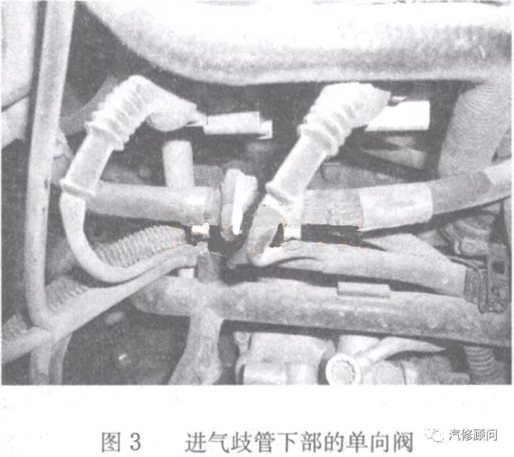 帕萨特领驭在起动发动机后,当氧传感器开始工作后(发动机处于暖机状态),发动机控制单元会根据负荷及转速信号开启或关闭炭罐电磁阀,炭罐电磁阀(图2)即开始工作。当涡轮增压器工作时,进气歧管内的压力升高,为了防止进气歧管内的混合气进入活性炭罐中,在活性炭罐电磁阀和进气歧管之间安装了一个单向阀,该单向阀安装位置在进气歧管下部,如图3所示。在涡轮增压器工作以后,燃油蒸气由涡轮增压器进气口随增压空气一起进入发动机燃烧。