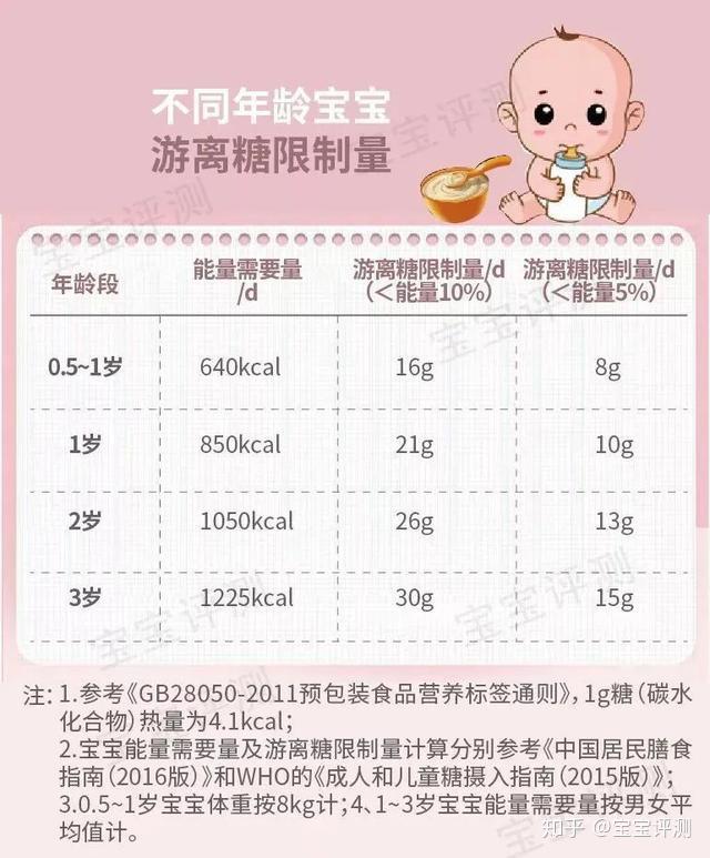①游离糖:甜度高,热量大(碳水化合物含量高),能够被人体快速吸收,摄入过多会对健康产生不利的影响(肥胖、龋齿、慢性病、嗜甜等),宝宝应严格控制每天的摄入量。